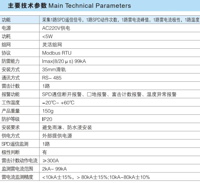 浪涌保护器劣化监测:监测浪涌保护器遥信端口信号,通过自身采集系统,不间断的采集遥信端口信号,当信号断开时,采集系统秒级报警。雷击计数监测:由电流感应器件、信号处理电路及电磁计数器构成,电流感应器件紧靠浪涌保护器件入地线,感应的电流信号经限幅、整流、滤波后驱动电磁计数器将雷电次数记录下来。雷电流峰值监测:由电流感应器件、信号处理电路及电磁计数器构成,电流感应器件紧靠浪涌保护器件的地线,感应的电流信号经限幅、整流、滤波后驱动电磁计数器,将雷电流峰值记录下来。